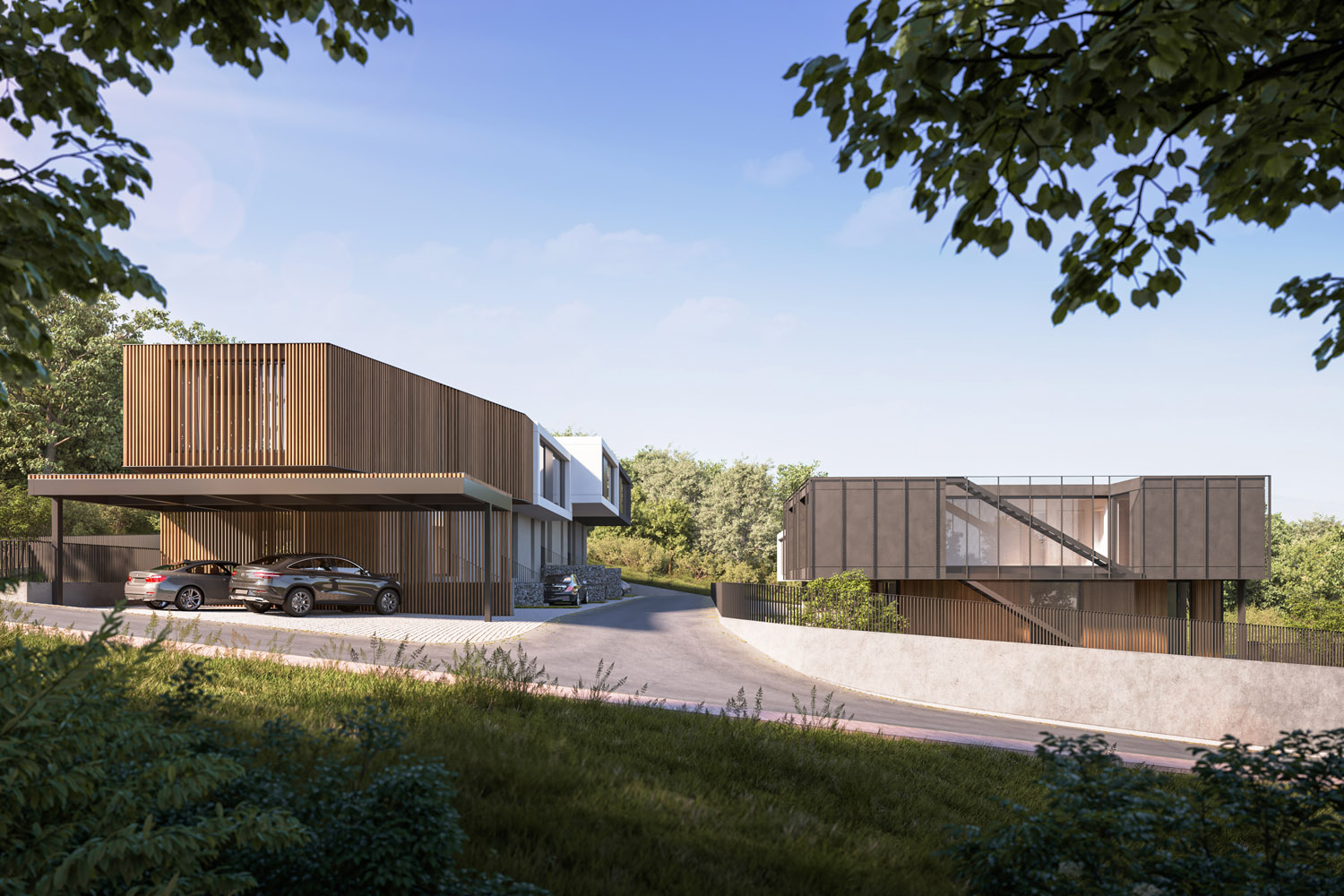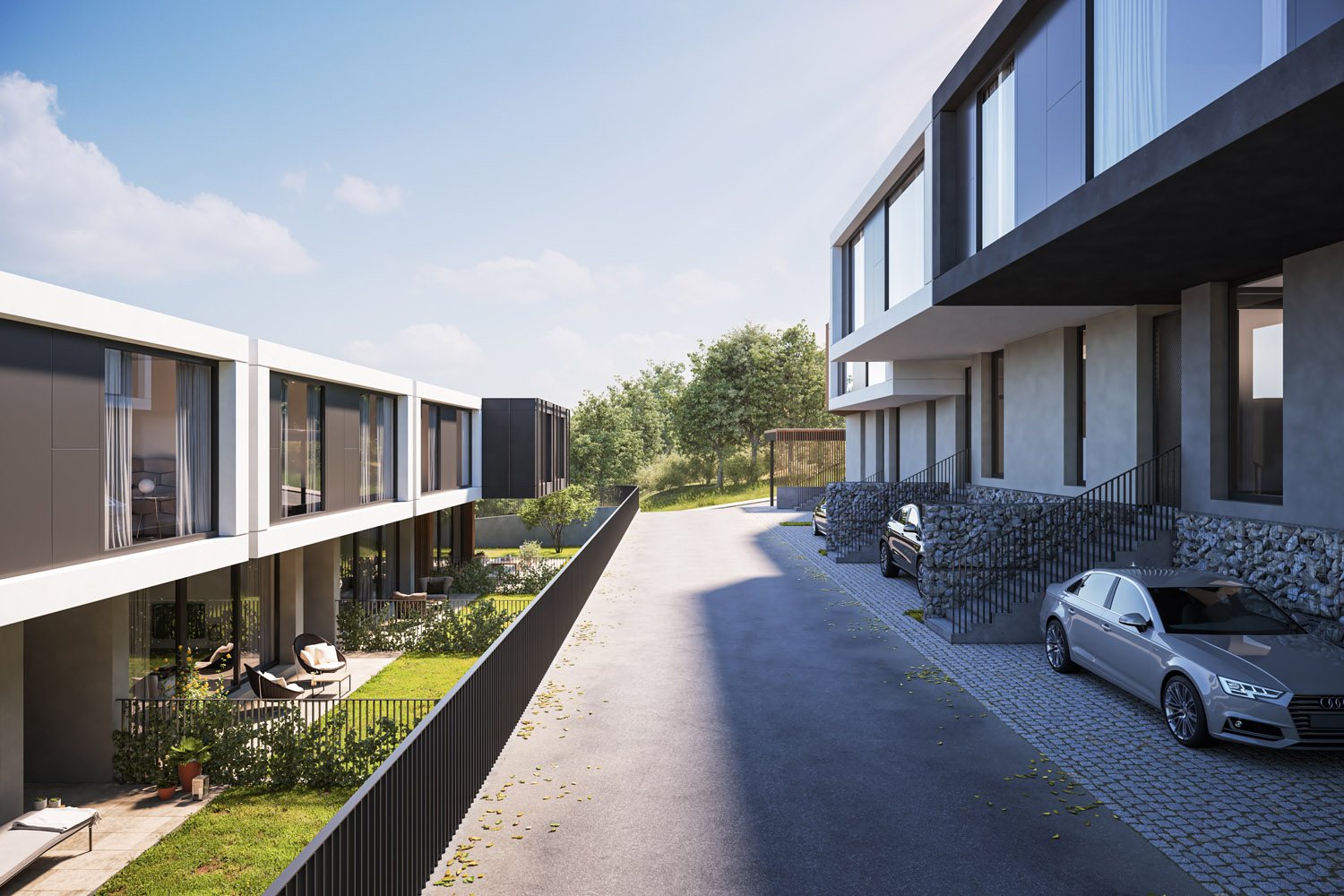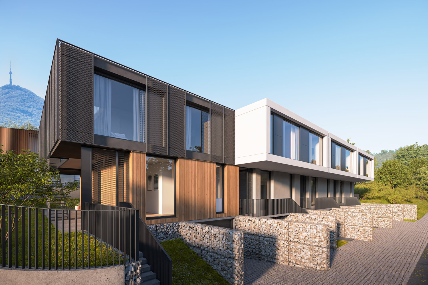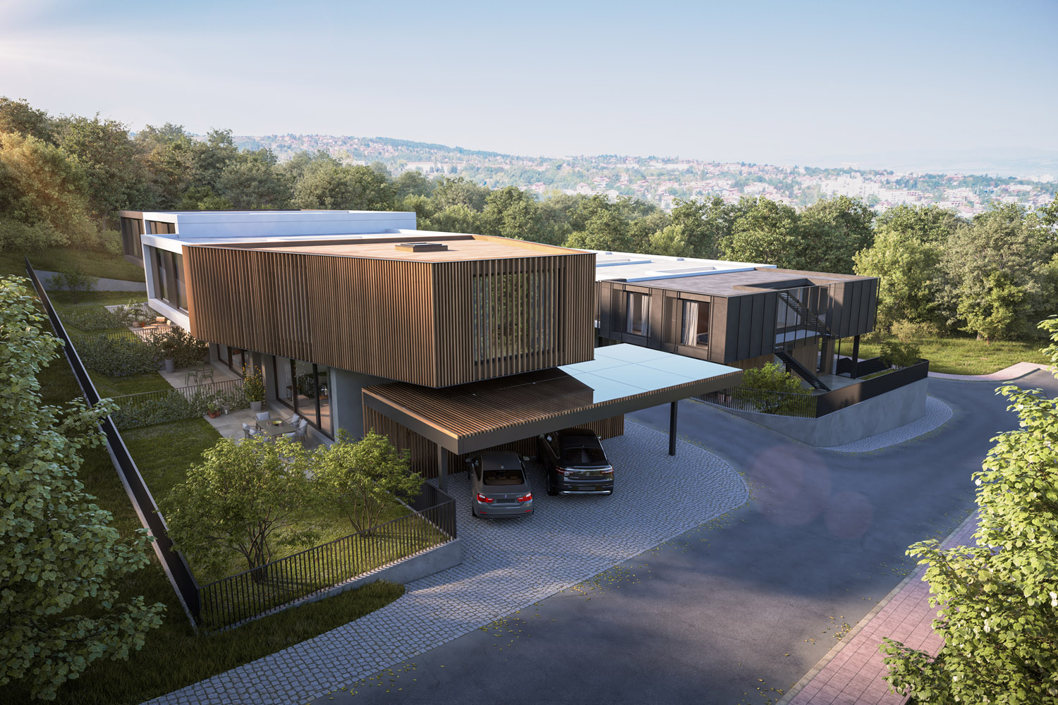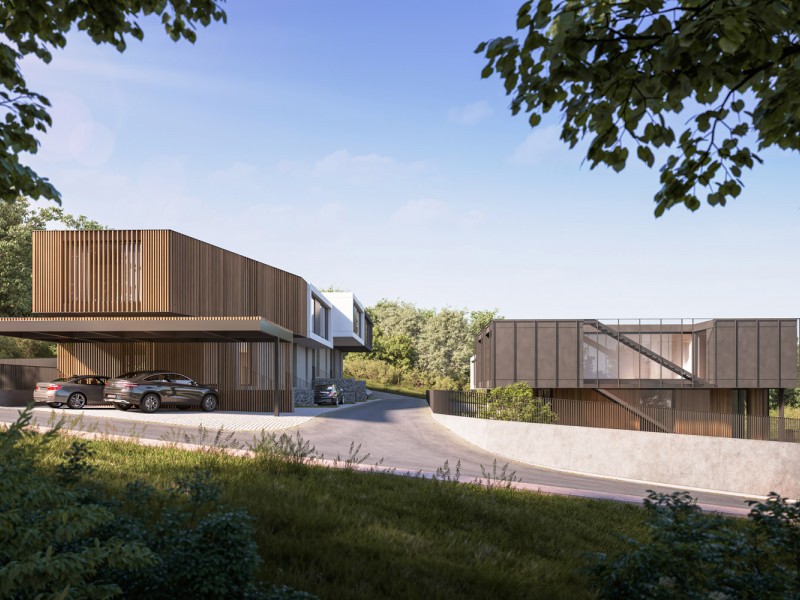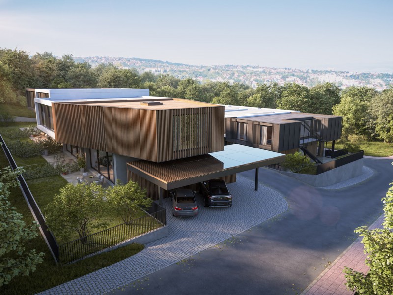 Къщите са проектирани да осигуряват много светлина с гледки към планината и града. Фасадите и другите екстериорни елементи се изпълняват с висококачествени топлоизолационни материали, висококачествени дишащи мазилки, дърво, камък и метал.