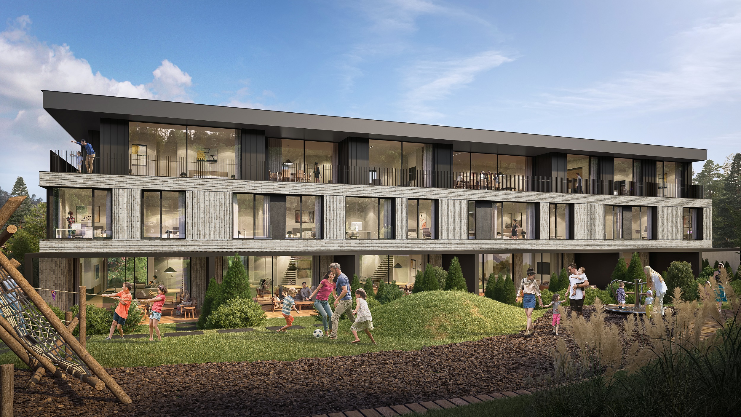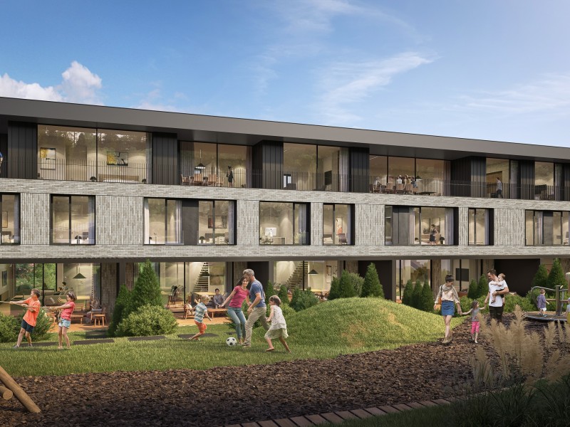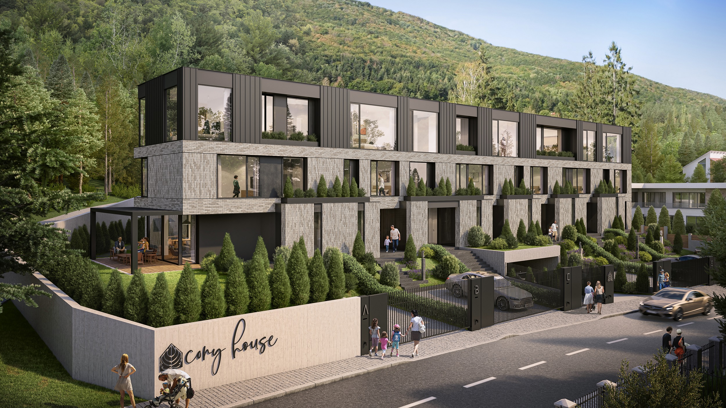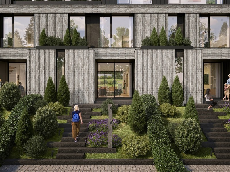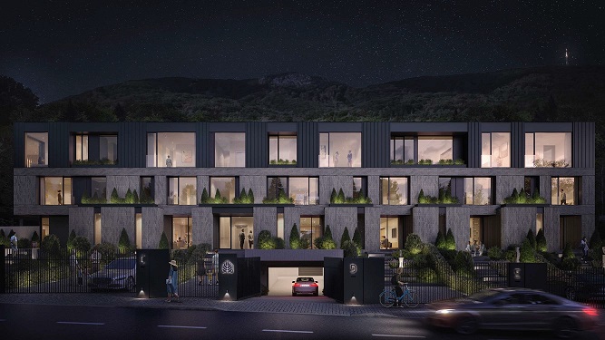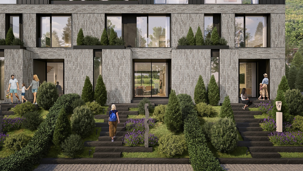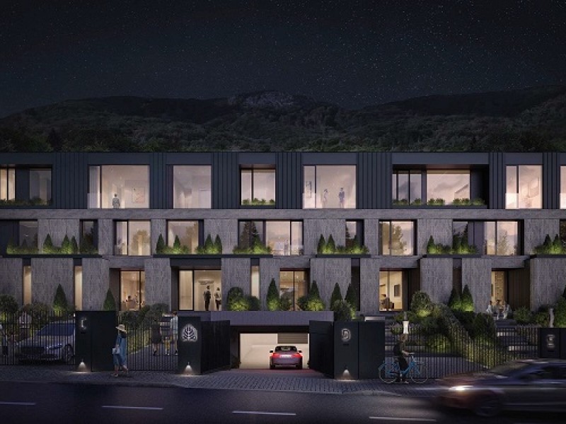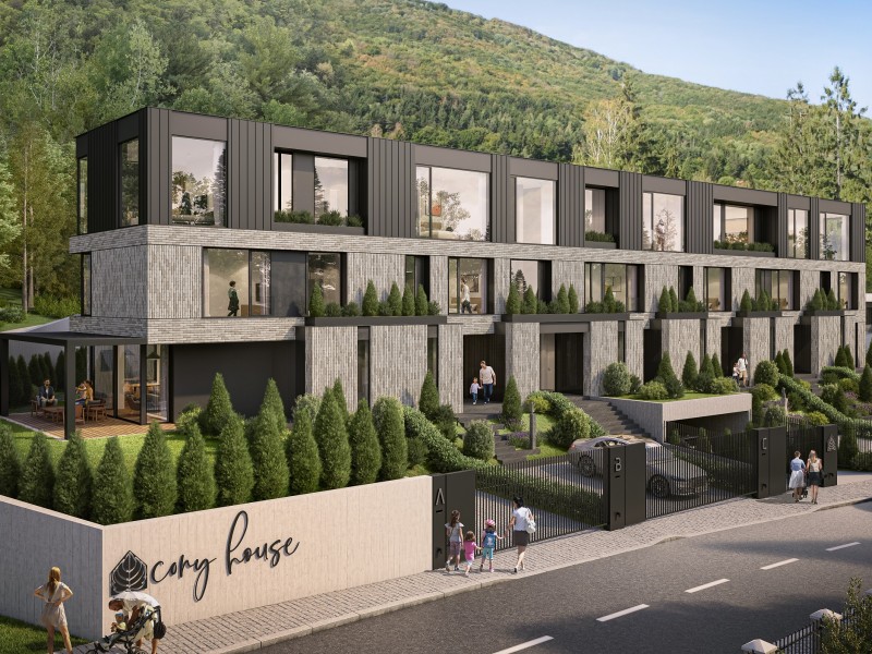 01 Описание Иновативна сграда в концепцията “Къща в къща”, състояща се от шест еднофамилни къщи и два апартамента. Сградата се намира в гр. София, в.з. Киноцентър, ул. Лешникова гора.