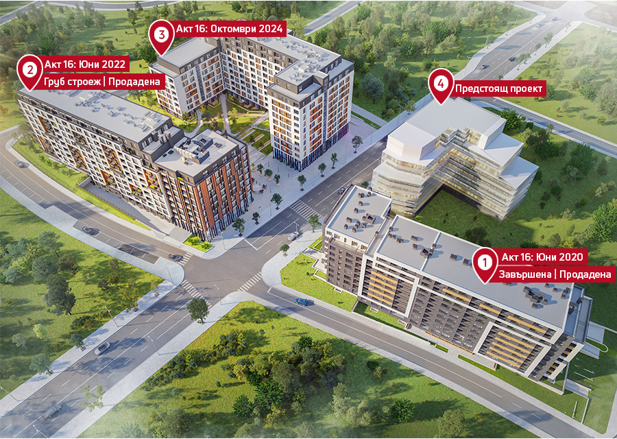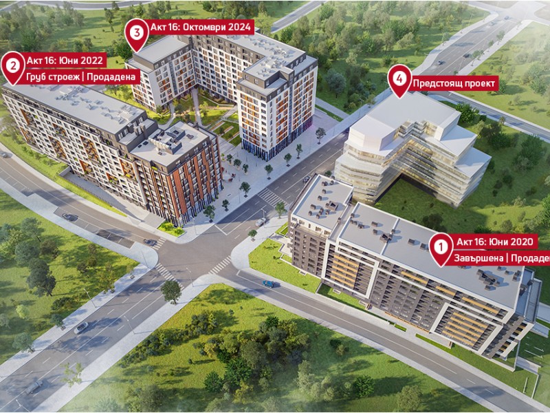 MONA - сгради 1 и 2 са вече завършени, сграда 3 ще бъде завършена октомври 2024 г. и предстои изграждането на сграда 4. MONA - сграда 3 предлага голям избор от едностайни до четиристайни удобни и функционални апартаменти, подземни гаражи и паркоместа. Между MONA - сграда 2 и MONA - сграда 3 е предвидено изграждането и на общ двор със зелени площи и място за отдих.