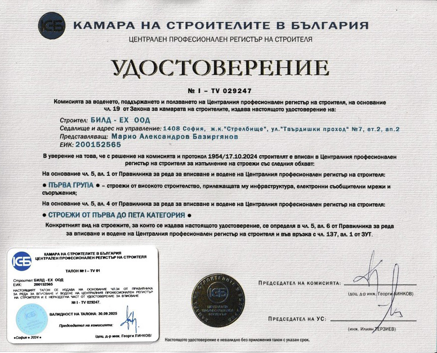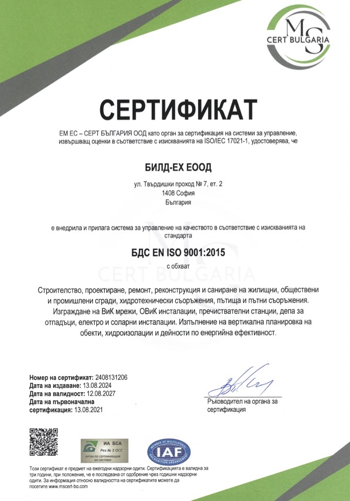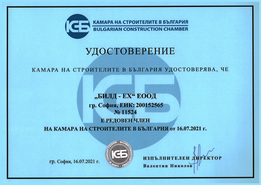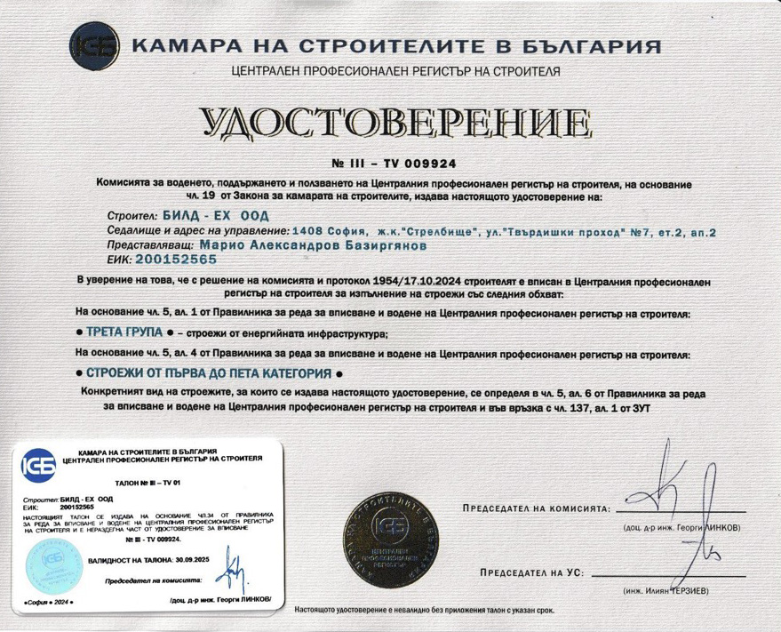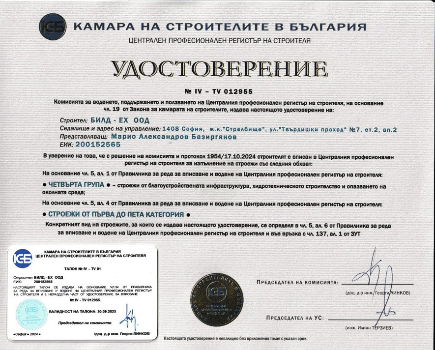 Фирмата е сертифицирана по международните стандарти ISO 9001:2015, ISO 14001:2015, ISO 45001:2018, а в съответствие със законодателството на Р.България дружеството е вписано в ЦПРС за всички групи и категории строежи.