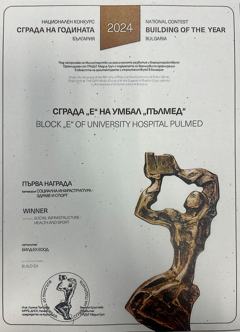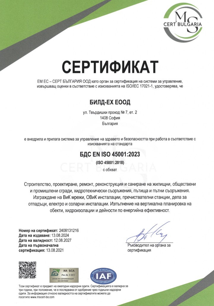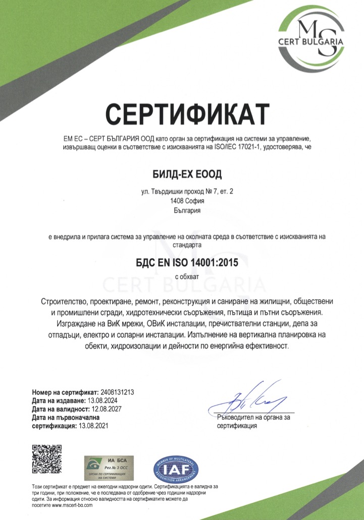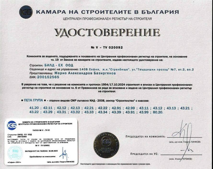 Фирмата е сертифицирана по международните стандарти ISO 9001:2015, ISO 14001:2015, ISO 45001:2018, а в съответствие със законодателството на Р.България дружеството е вписано в ЦПРС за всички групи и категории строежи.